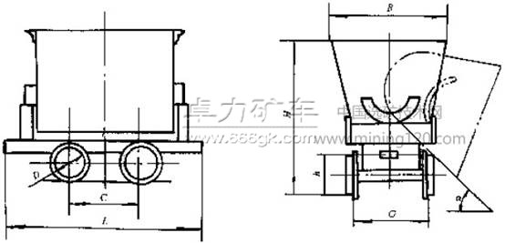3.1 礦車型式為翻斗式,按車箱形狀分V型和U型。V型車一般以運(yùn)輸松散密度在1800kg/m3以下的物料為主,多用于地表作業(yè);U型車一般以運(yùn)輸松散密度在2500kg/m3以下的物料為主,多用于井下作業(yè)。