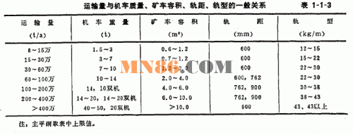 階段運輸量與礦車容積的一般關(guān)系見表1-1-3。