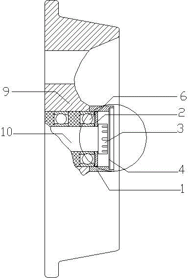 礦車輪對密封裝置、卡簧本實用新型公開了一種礦車輪對密封裝置,包括套置于輪對軸承(10)外部并固定在輪轂(9)上的密封筒(1),密封筒(1)內(nèi)壁與輪對軸承(10)外側(cè)之間設(shè)置有油封(2),輪對軸承(10)端部設(shè)置有防松緊固螺母(3),防松緊固螺母(3)的底部與油封外表面緊密配合,在密封筒(1)內(nèi)設(shè)置有防塵蓋(4),